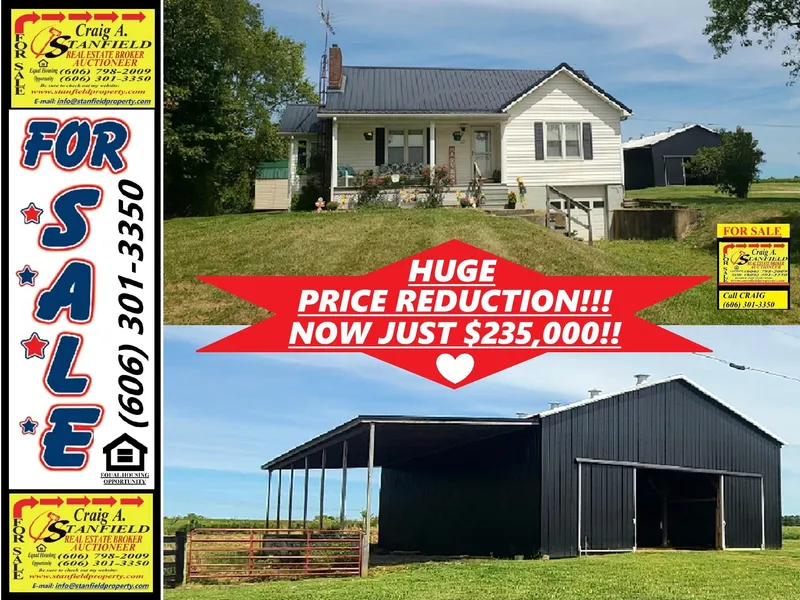 TOLLESBORO 127 EAST EVANS ROAD - 5 Bdrm., 1 Bath, One and One-Half Story Frame Home Over Basement! Home offers a remodeled kitchen, refinished hardwood floors (living room and 3 bdrms), offers 3 bdrms on the main level with two upper level bdrms, living room with hardwood floors and fireplace, steel roof, double-pane windows, CH/CA, a full basement (drive-in garage plus storage areas), situated on 1.953 acres with a barn with attached shed and a fenced-in pasture area (great for a horse or cow/calf, 4-H/FFA project), conveniently located just off KY 57 approximately 1 mile south of the AA Hwy and 1 1/2 miles south of the intersection of KY 57 and KY 10, served with water, electric and sewage, and PRICE REDUCED!!! HUGE PRICE REDUCTION!!! NOW JUST $235,000!!!