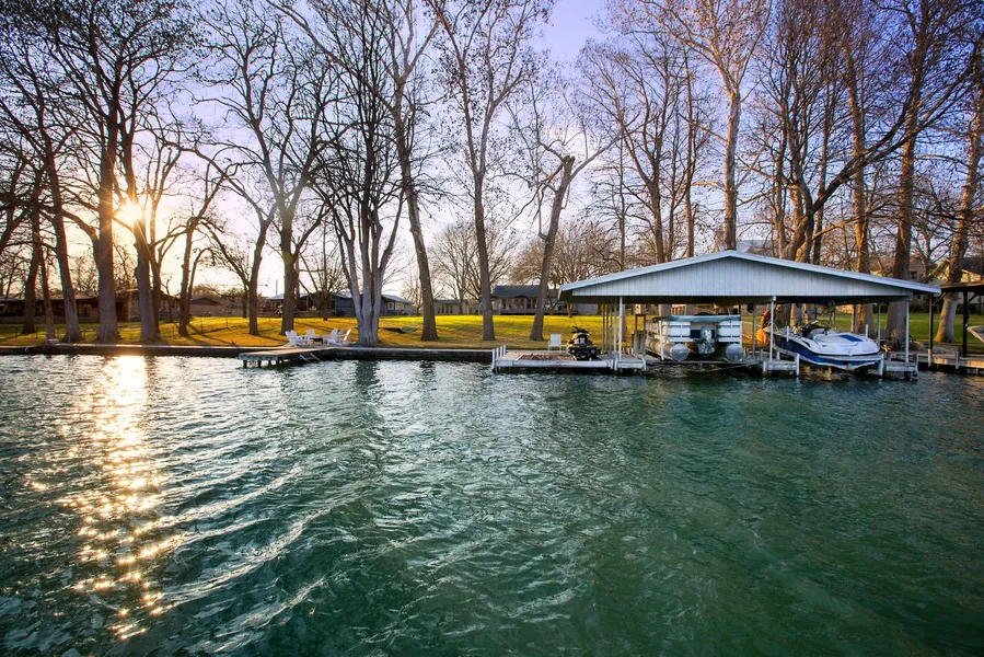 146 of prime east facing lake frontage. Waterfront house and guest house sit on large .89 acre lot. In addition the 2 undeveloped acres across the street is included. Boat house accommodates 2 boats (currently 1 ski boat (21 foot/4500lbs) and 1 pontoon boat (21 foot/3,500lbs) and separate PWC dock for 2 water craft. Guest boat dock/tie off area on PWC dock. This property is fully fenced and secured by an electric gate at front entrance. Main house is 3 bedroom, 2 bath. Guest house is 1 bedroom, 1 bath and sitting area. Main house has large kitchen with open dining/living and gorgeous lake view via 4 sets of French doors. Spacious master bedroom with lake view and large bathroom. Large 2nd bedroom with lake view shares a bathroom with 3rd bedroom. Large wrap around deck which accommodates outdoor dining, lounge chairs, umbrellas and grilling area overlooking the magnificent yard which is ...