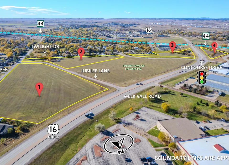 NEW LISTING LOCATION! LOCATION! LOCATION! Four prime development lots are being sold as one unit—an exceptional opportunity for developers, investors, or businesses seeking a strategic foothold in one of Rapid Valley’s fastest-growing commercial corridors. Perfectly situated just off Hwy 44, at the high-exposure corner of Elk Vale and Concourse (also fronting Jubilee), and positioned directly beside the Safeway lot, this property offers unparalleled visibility and access. It is a high-traffic, high-growth location surrounded by established businesses, new construction, and expanding residential neighborhoods that continue to fuel demand for services, housing, and retail.