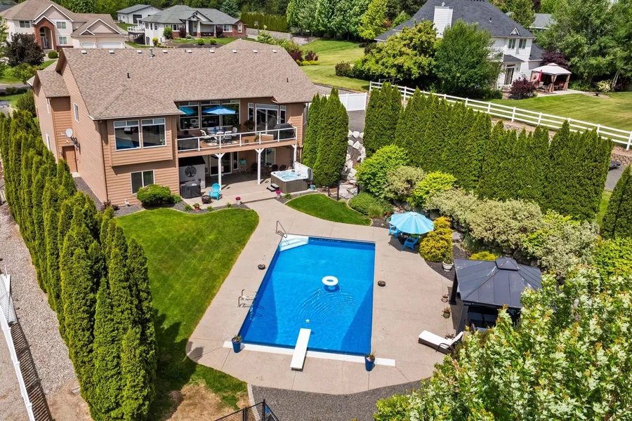 Tucked at the end of a quiet cul-de-sac, this updated 4,528 sq ft home sits on 1+ acre with captivating mountain views. The open-concept design centers around a remodeled chef's kitchen featuring an oversized granite island, rich LVP flooring, and a coffered dining ceiling. The main level offers a luxurious primary suite with Italian marble, private office, guest bedroom, and spacious mudroom. The lower level, with separate entrance, includes a large rec room, two oversized bedrooms, full bath, and abundant storage. Outdoors, enjoy a resort-like in-ground pool surrounded by mature arborvitaes for privacy, a covered deck for year-round enjoyment, and a detached shop for hobbies or storage. Elegant, private, and move-in ready — a rare find combining comfort, updates, and convenience in one exceptional property.