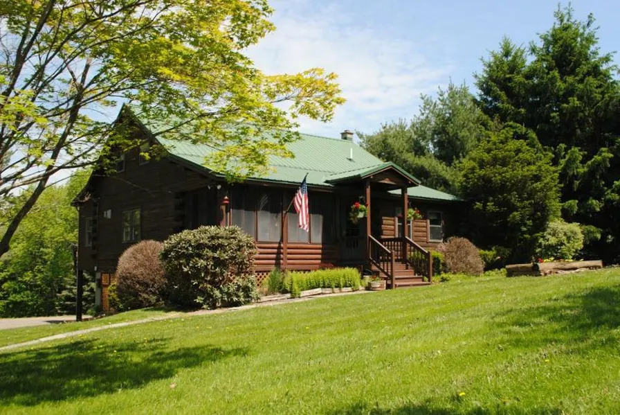 Energy efficient 3 bedroom 2 bath, real log home with full basement w/ post card setting and commanding views. Home features: Spacious living /dining area w/ fireplace, eat in country kitchen with luxury appliances, sun room, enclosed porch, solar heated in-ground pool complex with gazebo. Much more!