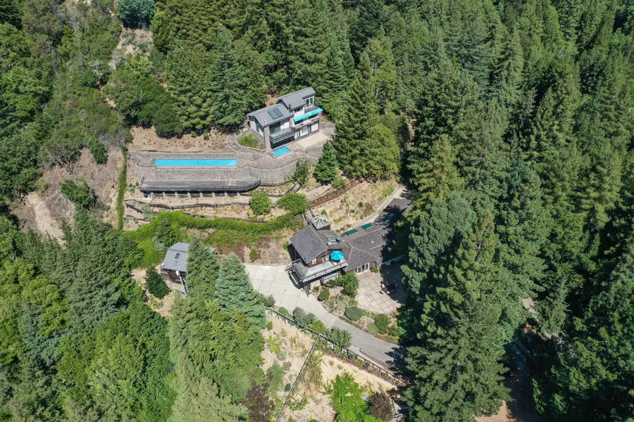 The guest house sits near the top of the property and from here you have a view of the downtown San Francisco skyline. This structure is three levels, connected by a custom-built spiral wooden staircase and surrounded by windows, which make it feel like an adult tree house. The first level connects with the terrace and has a full pool bath. The second floor is the main entry and principal living area with cathedral ceilings, plentiful built-ins, and commanding views. There is a substantial space for entertaining and dining on this level plus a petite kitchenette. The upper floor is a versatile space which could be an office, bedroom, or both with breathtaking views. There is a newly resurfaced lap pool and a spa (not in use) just steps from this home. The pool has solar panels as well. A wonderful place to enjoy the stunning views, the sunrise or bask in the moonlight.?
