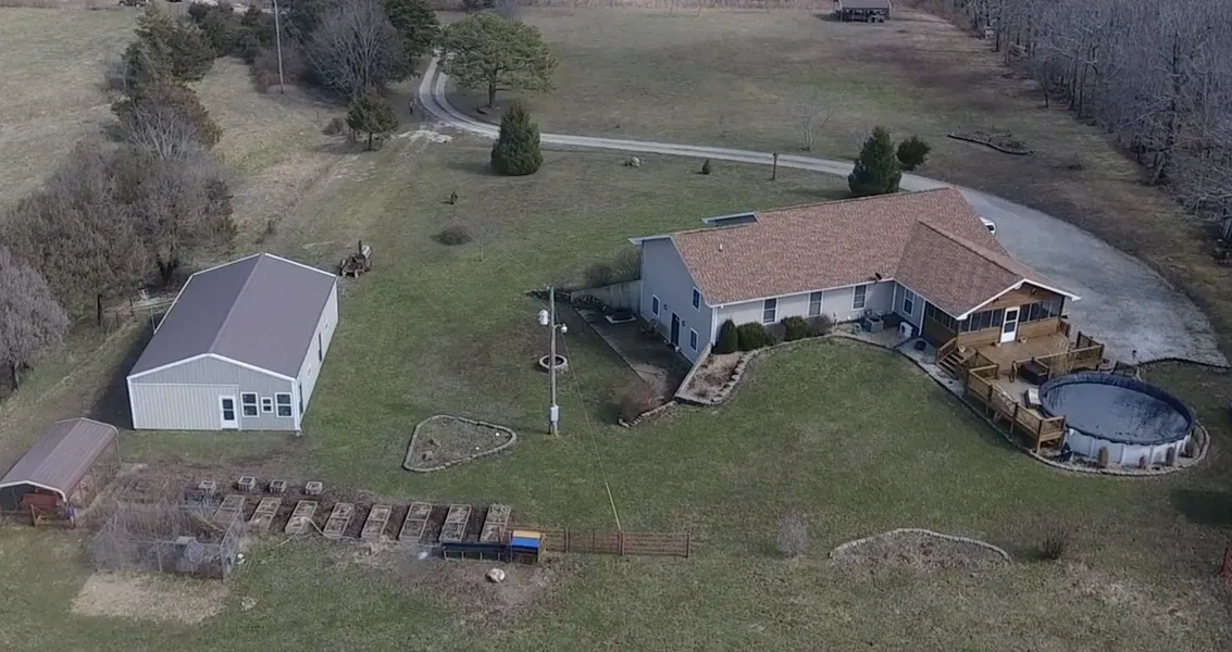 Out of Willow Springs take South 63 for 6 miles, go right on County Road 5346 - West to end on left - red corners.