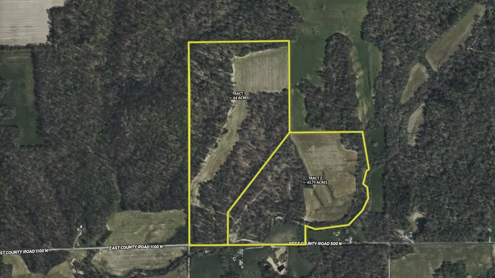 Tract 1 of 2: This +- 64-acre rural tract near Osgood, Indiana, offers a balanced mix of approximately 18 acres of dormant tillable landleft uncultivated for two yearsand roughly 46 acres of lightly harvested hardwood forest. The tillable soils consist primarily of silt loams with favorable productivity ratings. Road access is straightforward from County Road 500 North, where the property includes about 500 feet of frontage. Electric and water infrastructure are accessible along the roadside. A recent survey (December 2024) clearly defines the overall acreage and exterior boundaries (not reflecting the parcel split). The tract extends roughly 2,700 feet back from the road, yielding a long, private parcel layout. At the rear, a field opens up with minimal visibility from the roadside and very few surrounding homes in sight. The terrain includes a diverse mix of open field, forested edges, trails, and internal access lanesideal for low-impact movement, particularly during deer or turkey seasons. This arrangement facilitates quiet ingress and egress, reducing disturbances to wildlife. Importantly, there is no floodplain present on the tract. Potential uses vary, including new residential construction, small-scale farming or livestock, recreational hunting, or long-term investment. The combination of quality soils, mature timber, utility access, defined boundaries, and a deep, private layout supports a broad range of rural land. Whether pursued as a home site, hunting ground, or investment, this parcel delivers functional flexibility in a quiet Indiana setting. Ripley County is home to Versailles State Park, with over 3,000 acres of forests, trails, and a 230-acre lake for fishing and boating. Nearby, Big Oaks National Wildlife Refuge spans more than 50,000 acres across several counties, offering public hunting, wildlife observation, and habitat for diverse species, enhancing the area’s outdoor recreation appeal.