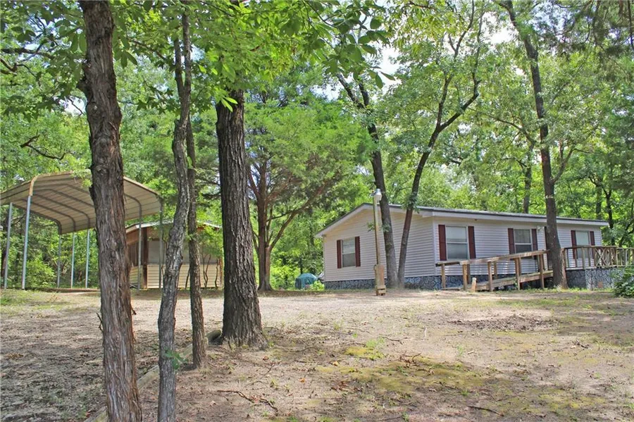 Furnished 3 BR, 2 BA home sitting on 4 lots (0.745 mol Acres) in Gated Community with slight view of Private 365 mol Acre Fishing-Skiing Lake. Road Frontage in the back and front of home. Heavily treed giving nice, peaceful, country feel. R.V. Shed with water and electric. 4-seasons out building. Home features open eat-in kitchen with updated cabinets and living area with vaulted ceilings and electric FP. Split Bedrooms. Nice Laundry. Wrap-around deck.