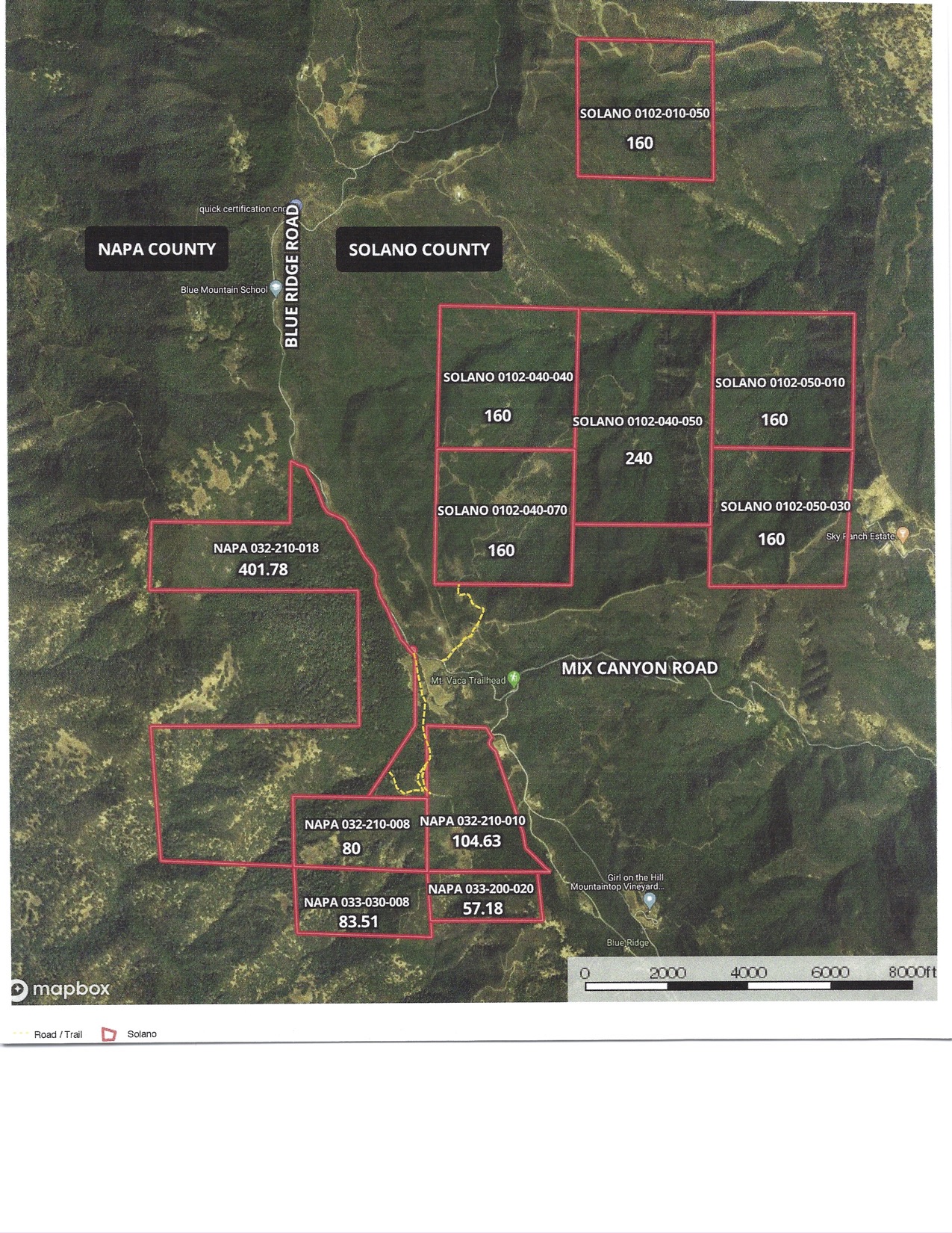 Are you looking for a remote, yet close to home wilderness property? Located high above Vacaville on Blue Ridge in the Vaca Mountains, is this amazing recreation/hunting ranch with tons of hiking trails. The ranch boasts several parcels which can be possibly purchased separately or as one large parcel 727.10 ac. The land is rugged enough to provide habitat for trophy black tail deer, wild pigs, bear, Mountain Lion, bobcats, fox, quail, and occasionally Wild Band tail Pigeon The ranch features access road thru a private access behind a locked gate. This property is perfect as a private recreational and hunting paradise for family and guests beautiful views over looking Lake Curry. Parcels included in 727.10 ac which can be purchased together or separately are 032-210-018 401.78 ac ,032-210-008 80ac, 032-210-010 104.63ac 033-200-028 140.69