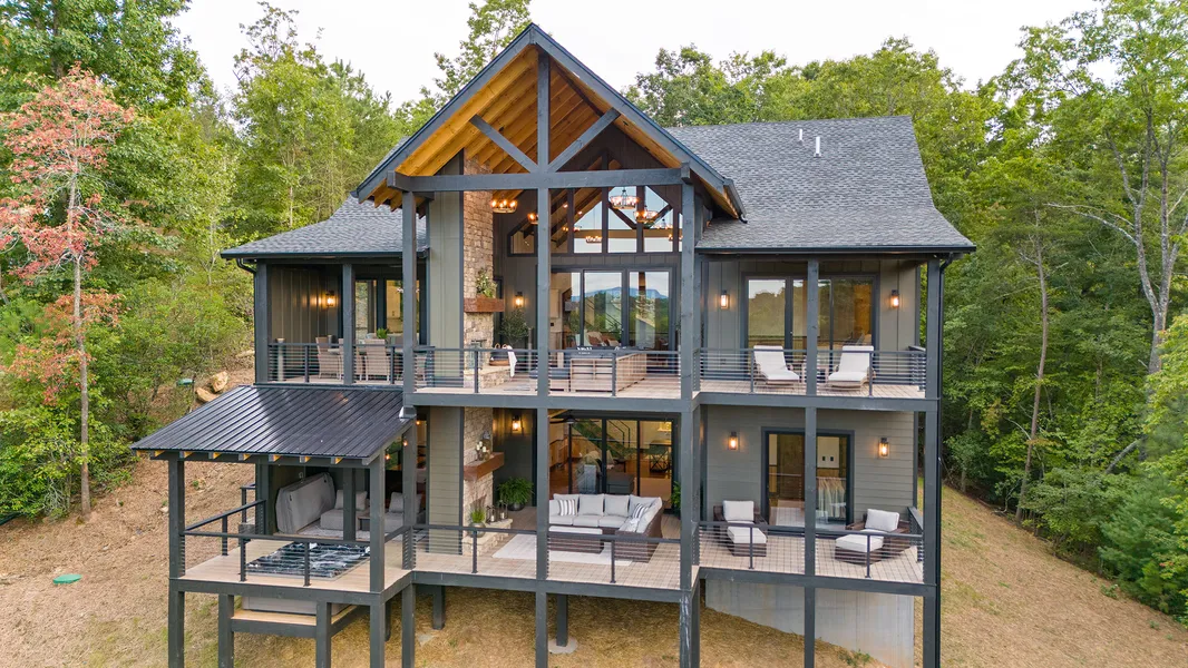 Welcome to Staurolite Hideaway.... your private retreat in an upscale community just two miles from downtown Blue Ridge. Just completed by Kevin Teague Custom Homes, this 5BR/4BA home provides comfort and privacy for all family and guests. The main living area is surrounded by walls of glass in the front and the back, cathedral ceilings, a stone fireplace, custom built-ins, office, half bath and seamlessly transitions into the large kitchen and dining room. The primary suite is located on the main floor and enhanced with tall ceilings, mountain views and spacious en suite bathroom with double vanities, tile shower, soaking tub and generously sized walk-in closet. Upstairs you will find a spacious bedroom/bath with private balcony. On the terrace level, another kitchenette and living room provide accessible and convenient living, and three additional bedrooms and two baths ensure comfort ...