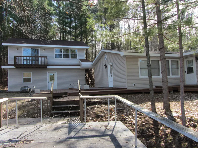 Privacy, Privacy, Privacy , 430' frontage and 10 acres with a 2 bedroom 1 bath cottage with a comfortable open kitchen/dining/living areas with some great lake views. The detached garage has a 2 bedroom l bath cottage above,see dimensions under 2nd floor. The Sellers are in the process of finishing the upper guest cottage above the garage and cabinets need to be installed in the kitchen and plumbing hooked up in kitchen and bath. This would make a great guest cottage for family and friends. Also on the property is a dry boathouse for storage of all the waterfront fishing equipment and toys. The property has beautiful rolling wooded land, with sand swimming frontage. South Two -214 acres, 69' deep, clear lake, with muskie, northern, walleye bass and panfish.The lake is connected to North Two by a channel access mostly by canoe or small boat.Come check this one out, might be perfect for yo...