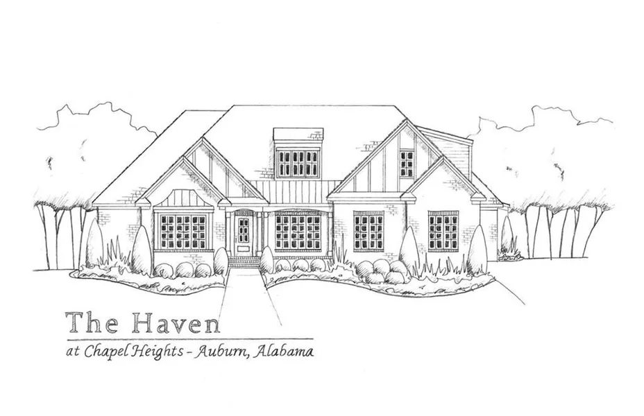 The Haven plan offers dedicated spaces for versatile living on an acre lot. An open foyer is flanked by a dining room & a study accessed by French doors. In the living room, a wall of windows provides an unobstructed view from the foyer to the large vaulted back porch, complete with a fireplace. The living room features a gas fireplace, built-ins, & a vaulted ceiling. The kitchen offers abundant storage with walls of ceiling-height cabinetry, a generous island, & a breakfast room. A second fireplace is located in the cozy keeping room. Three bedrooms are on the main level, including a spacious primary suite stretching from front to back. The bath features separate vanities, a soaking tub, walk-in shower, & expansive closet. Two additional bedrooms share a full bath with dual sinks. A large mudroom & powder room contribute to the home's functionality. Upstairs offers a sizable bedroom, full bath, flexible landing space, & a vast playroom that could serve as an additional bedroom.