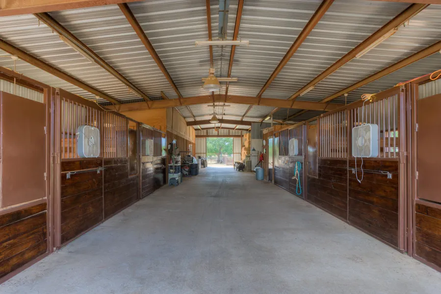 Horse Barn: 40 x 90 Horse Barn with 6 private solid wall stalls, sliding doors, fans and state of the art fly spray system. There is electric and water to each stall. The feed room is air conditioned with a utility sink, horse grooming / wash rack with cross ties, and a tack room with 20 saddle racks and 40 bridle hooks. Washer and Dryer hookups with access from the barn and living quarters. There is a storage section for 300 bales of hay in the barn.