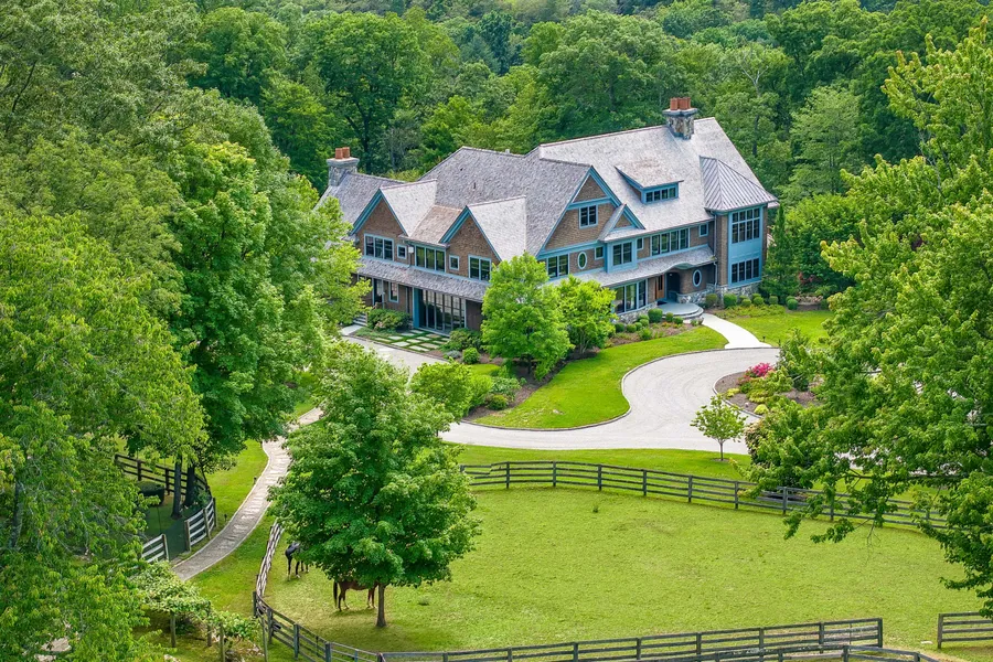 Cinematic equestrian estate and family compound on 16+ acres with three residential structures providing a total of 11 bedrooms and 13 bathrooms in backcountry Greenwich, Connecticut. Enter through custom 20 foot tall wrought iron gates that meander down the drive to the handsome shingle-style main residence perfectly nestled on the private park-like property. Completely renovated in 2023, the main residence features an adjoining one bedroom guest house/pool cabana alongside the infinity edge pool, an aviary, multiple paddocks, vineyards, vegetable gardens and fruit orchards.