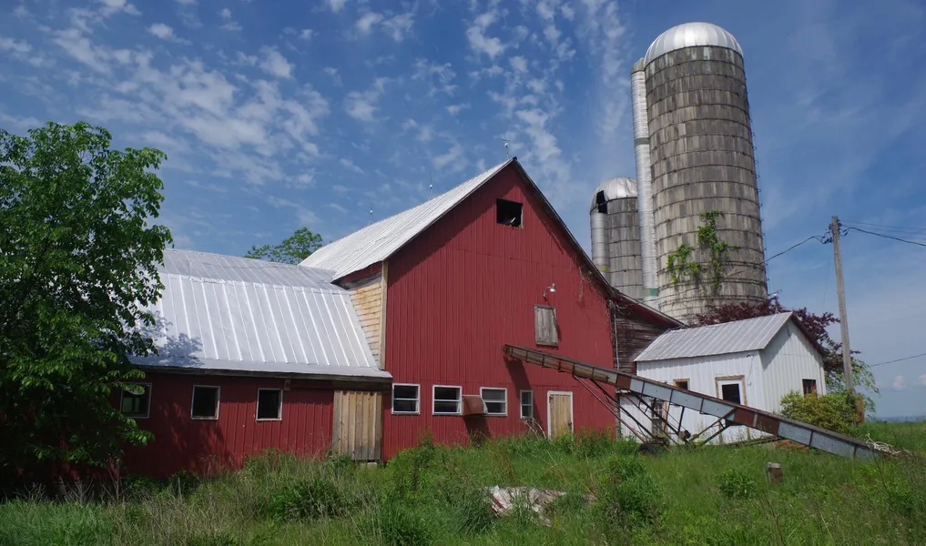 The barn is 32x112' in the main section (it is L-shaped) and once held 40 milk cows. Dairy amenities are no longer present. There are 18x60 and a14x40 silos. A hay elevator and a mow conveyor are included. The barn has a new electric service.