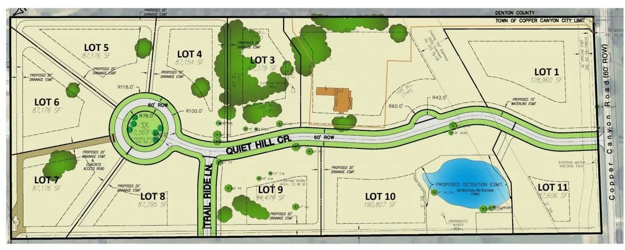 Quiet Hills Subdivision in Copper Canyon comprised of 11 Lots ranging from 87,176 sq ft to 128,960 sq ft.