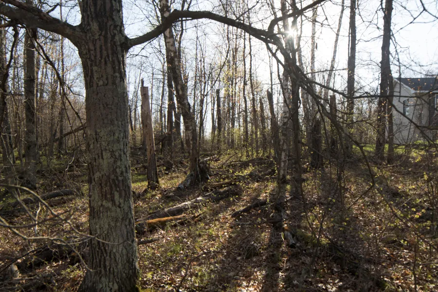 The trees looked to be a mixture of maple or oak. It is mostly level.