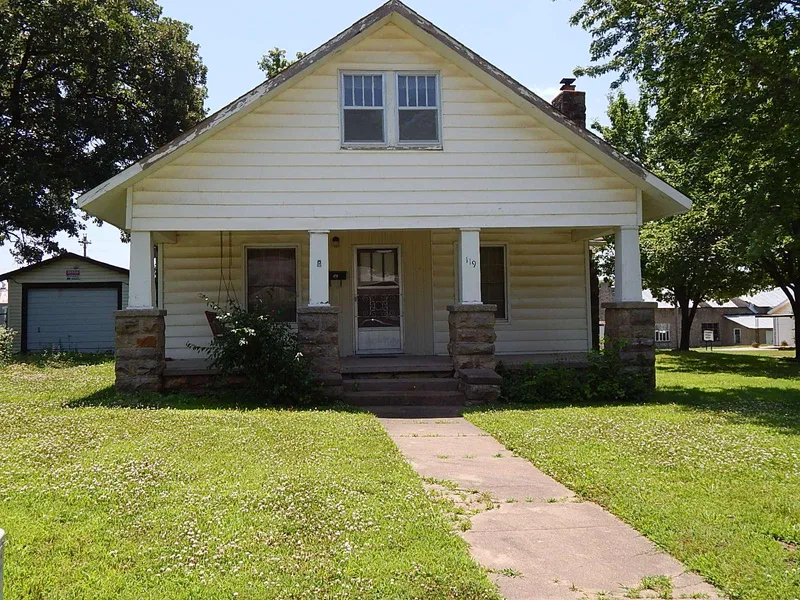 What a great home with a lot of character! This wonderful 2 story home consists of 1,572 sq. ft. It has 4 bedrooms (2 down stairs and 2 upstairs), 2 full baths (1 upstairs and 1 down stairs), large kitchen with appliances and utility room. There is carpet throughout the home with beautiful wood trim and a window seat in the dining area. It is heated and cooled by a window unit and floor furnace. It also consists of a beautiful brick gas fireplace and french doors that lead into one of the down stair bedroom. Outside there is a single car carport and a small storage building. One of the nice features of this home is that it has a great front porch with porch swing all sitting on a large corner lot. We have a motivated seller.