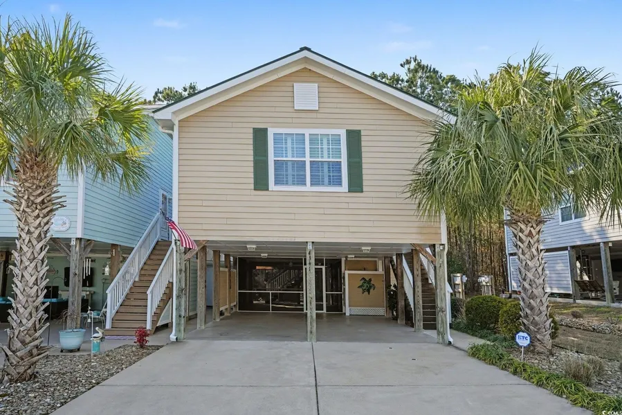 Experience the ultimate coastal lifestyle in this meticulously maintained home nestled in the desirable natural gas community of Grande Harbour. Situated just minutes to the Beach, golf and dining, this home is the perfect year-round retreat or weekend escape. The most unique feature of this home is the ground-floor entertainment area which opens up to a wooded backyard. The expansive screened-in patio retreat with lots of space includes a separate enclosed wet bar with commercial ice maker, beverage cooler and built-in sink with cabinets. An extra storage room with electric is great for those extra beach chairs and umbrellas. An outdoor shower is included for cleaning off the Beach sand before enjoying a dip in the community pool. Additional storage in the backyard with a patio shaded by private trees gives you more space to entertain. This move-in ready property features a bright, open layout enhanced by vaulted ceilings, abundant natural light, pocket doors for added space and timeless plantation shutters throughout. The kitchen is designed for entertaining with it's white raised-panel cabinetry, center island, granite countertops, recessed lighting, beautiful wood-like tile flooring and stainless steel appliances which include a gas stove, built-in microwave and refrigerator. Two over-sized bedrooms with en-suites on opposite sides of the living area for privacy, with ample closets and carpet that was replaced in 2022. Thoughtful upgrades include galvanized handrails on both front and back stairs, gutter guards and a professionally maintained HVAC system. All TV's and beds are included so bring your flip flops and suncreen and start enjoying the Coastal lifestyle!