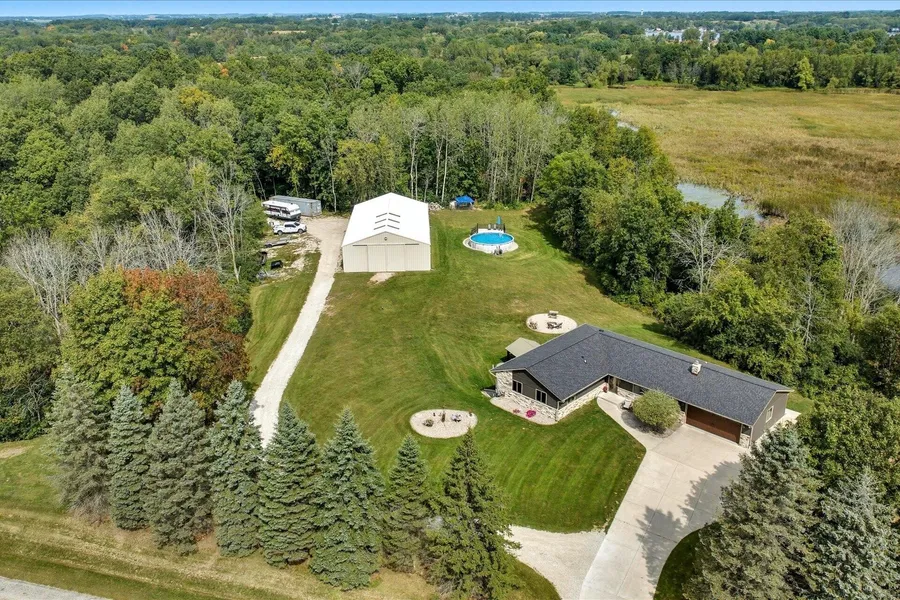Sportsman's retreat on 8.59 private acres with wooded trails, a walk-out lower level, and hunt-from-your-backyard convenience. The HUGE 42'x80' pole barn delivers a heated, spray-foam-insulated workshop plus massive storage for UTVs, boats, RVs, and all your gear. The attached GA even offers an EV charging outlet. After a day outside, warm up by the wood-burning fireplace, cool off in the pool, or unwind on one of two patios or at the fire pit. Nearly $300K in updates: new roof & gutters (2025), central air (2024), siding (2020), a Culligan system with iron filter (2024), newer appliances, and MORE! With 5 BRs, 3 full BA and a partially finished Lower-level, you'll have over 3000 square feet of space for your whole family. Quiet setting, room to roam, this is your year-round base camp.