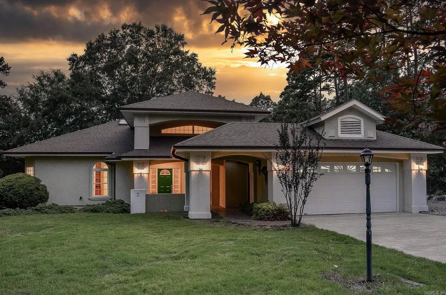 Level corner lot across from Lake Balboa... Bonus lot included makes this a bit over an acre. 3 bedroom split floor plan plus office and 2.5 bath home. Recent updates include roof-2024, HVAC 2023 & 2025, Large covered patio area with automatic screens-2023, sprinkler system for the lush landscaping and wandering walking paths throughout the planting areas. Buried propane tank for gas back-up system for HVAC, water heater and fireplace. Other updates include microwave-2025, range-2024 and disposal 2024. Hot Springs Village Property Owner Association has a new member buy-in fee of $2,000.00 due and collected at closing which seller will pay if applicable.