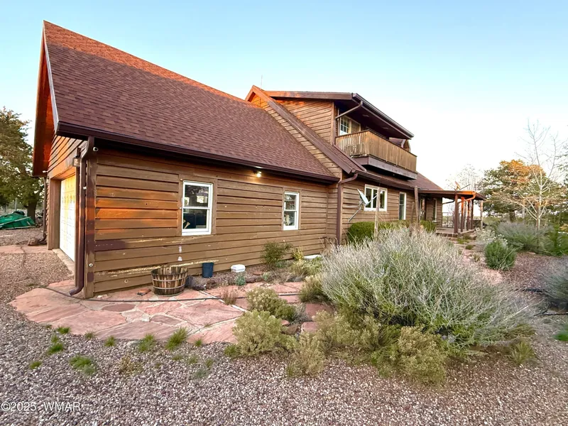 Discover 40 acres in Concho, AZ, featuring over 3,900 sq. ft. of living space between two homes, a massive shop, and a restored barn. Enjoy self-sufficient comfort with a solar power system, diesel backup generators, and a high-output well feeding a one-acre pond. The main 3-bed, 3-bath home blends rustic charm and modern luxury with four brick fireplaces, granite counters, open-beam ceilings, and panoramic mountain views. Relax on 1,200+ sq. ft. of decking or explore outdoor amenities including a volleyball court, BBQ area, and abundant wildlife—all just minutes from Show Low and Pinetop!