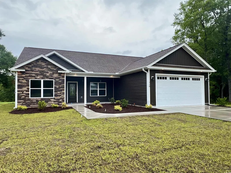 "PRICE IMPROVEMENT" This MOVE-IN-READY, new construction property is situated on a tranquil half-acre lot with a pond view and no HOA. The single-level LEXINGTON is an open-concept plan featuring a thoughtfully designed 3-bedroom, 2-bath home that complements your modern lifestyle. The front elevation is enhanced by stacked stone, board and batten siding, and an inviting porch, while the rear elevation includes a covered screened porch with an adjoining patio ideal for sunbathing and grilling. The landscaped lawn is equipped with an automated irrigation system. The two-car garage includes a service door and windows in the automatic garage door. This well-appointed home features wood laminate flooring in the living areas, primary bedroom, and hallway; tile in the laundry room and bathrooms; and carpet in the other bedrooms. It boasts designer lighting and ceiling fans, Delta faucets, and birch wood cabinetry with soft-close doors and drawers throughout. The kitchen includes quartz countertops, a stainless single-bowl sink, a tile backsplash, the stainless-steel GE appliances include a range, dishwasher, vented microwave, and French door refrigerator. The adjoining laundry room has a large pantry closet. The living room boasts an impressive, vaulted ceiling and features an electric fireplace along with a 12-foot sliding glass door that offers picturesque views and access to the rear lawn. The primary suite is enhanced by a tray ceiling and includes a bay window that provides an ideal space for a seating area. The en-suite bathroom is equipped with a tiled shower complete with a rain shower head and frameless glass door, a dual sink vanity topped with cultured marble, a private water closet, a spacious walk-in closet and linen closet. This residence is equipped with the Brilliant Smart Home system and includes a Builder Warranty.