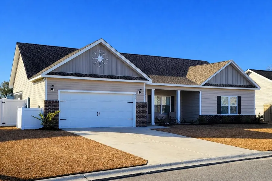 Welcome to 267 Lifestyle Court, an impeccably maintained, single-story coastal retreat nestled in the desirable Ocean Palms community. Thoughtfully designed with a custom floor plan, this 2024-built home has been used exclusively as a second residence by its original owners, offering a rare opportunity to enjoy a like-new home with refined finishes and meaningful upgrades already in place. Inside, luxury vinyl plank flooring runs throughout the home, complementing the light-filled, open layout. The kitchen is both stylish and functional, featuring quartz countertops, a white Kohler farmhouse sink, tile backsplash, and a full complement of stainless appliances, including a gas stove. Pendant lighting over the island and brushed nickel fixtures add a polished, contemporary touch, while the washer and dryer convey for added convenience. This home offers three bedrooms and two full baths, including a spacious primary suite with double vanities, quartz countertops, and a beautiful walk-in shower. Additional interior highlights include a wall safe, pull-down attic stairs with floored storage, and an efficient gas furnace system paired with electric A/C. Outdoor living is equally inviting with a front porch, rear patio, and new screened porch, perfect for relaxing after a day at the beach. Other recent upgrades include an irrigation system, privacy fence, added landscaping and custom interior paint throughout. Residents of Ocean Palms enjoy access to a community pool, enhancing the neighborhood’s relaxed lifestyle. And, of course, the beach is just a golf cart ride away! (Golf cart and furnishings may be purchased separately, if desired.) Combining modern construction, elegant finishes, and convenience, 267 Lifestyle Court is an exceptional opportunity to embrace effortless coastal living.
