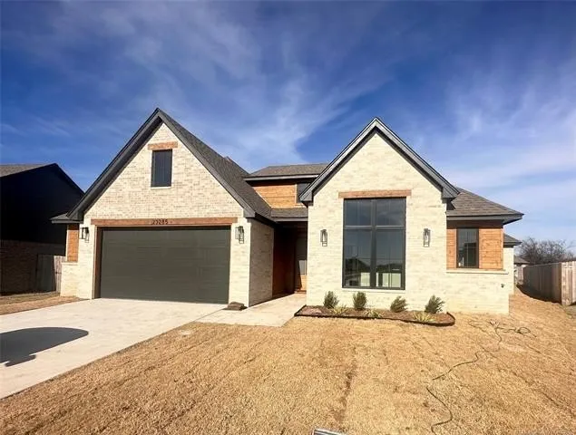 This beautifully crafted new construction home in Highland Ridge offers 3 bedrooms, 2 bathrooms, and an oversized two-car garage. Situated on a quiet cul-de-sac lot, the home is thoughtfully designed with upgraded fixtures, high-end finishes, and vaulted ceilings throughout. A dramatic 16-foot vaulted entryway welcomes you into a spacious open-concept living, dining, and kitchen area filled with natural light that features custom cabinetry, quartz countertops, and refined finishes. Each bedroom includes a walk-in closet, providing ample storage and comfort. The primary suite is a true retreat, offering a soaking tub, separate shower, double vanities, and an oversized walk-in closet with direct access to the laundry room. Built-in cabinetry in the mudroom, pocket office, and laundry area adds both functionality and style. This home seamlessly blends quality craftsmanship with modern living in one of Broken Arrow’s most desirable communities.