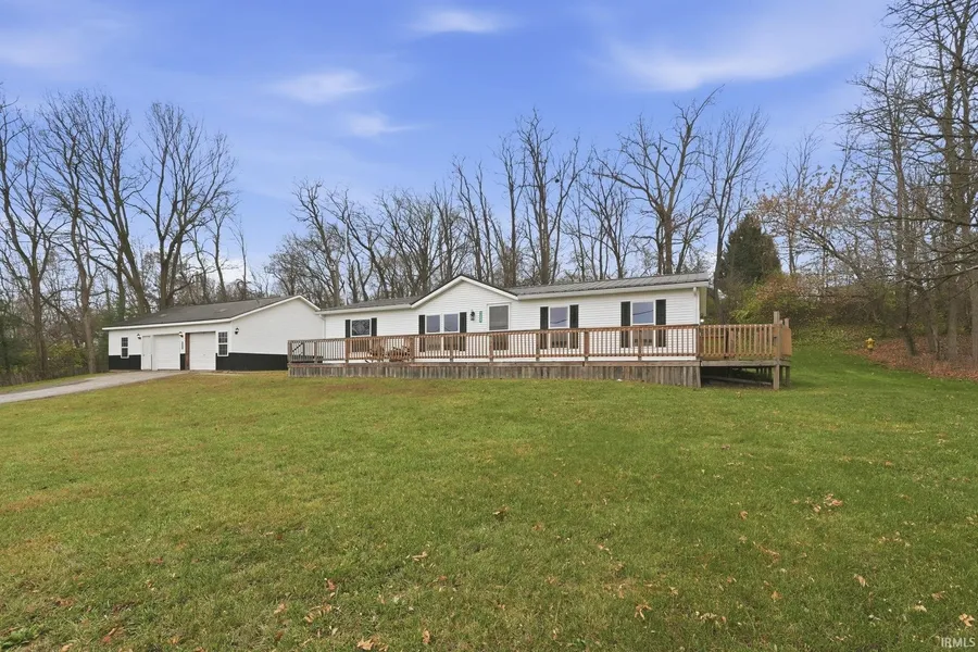 This charming and tastefully updated 3 bed, 2 bath manufactured home is clean, refreshed, and ready for its new owners! The exterior of both the home and the garage have been professionally power washed, and inside you will find fresh paint throughout, new laminate flooring, and an updated kitchen with all appliances including the washer and dryer remaining with the home. The split bedroom floor plan offers great privacy, with the spacious primary suite featuring a walk in closet and an ensuite bathroom complete with a soaking tub, double sink vanity, and a stand up shower. Sliding patio doors at the back of the home overlook the backyard and bring in great natural light. A standout feature is the massive 40 foot garage, offering an open, well lit workspace with excellent lighting, plus front and rear overhead doors for easy access. The home also includes a newer metal roof and a welcoming wrap around porch. Located directly on US 24, the property allows for quick commutes to Fort Wayne, Whitley County, or downtown Roanoke. This home offers immediate possession. Move in and make it yours today!
