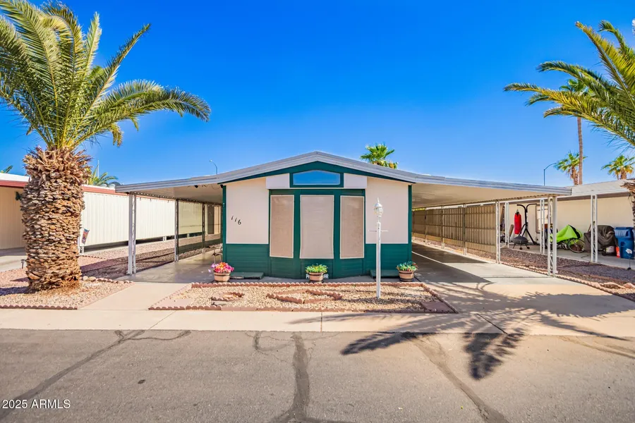 Seize the chance to own this charming 2-bedroom mobile home in the adult Community of Pueblo Manor! You're greeted by an inviting covered patio perfect for morning coffee. Inside, you'll find a living room with vaulted ceilings, wood-panel walls, blinds, and wood-look flooring. The eat-in kitchen comes with ample wood cabinetry, SS appliances, and a peninsula with a breakfast bar. The primary bedroom includes a private bathroom with double vessel sinks and a walk-in closet for keeping clothes organized. You'll also find a versatile bonus room, ideal for an office or a cozy lounge. The Community boasts a recreation center, a game room, pickleball, shuffleboard, a relaxing spa, and a refreshing pool. Make this yours today!