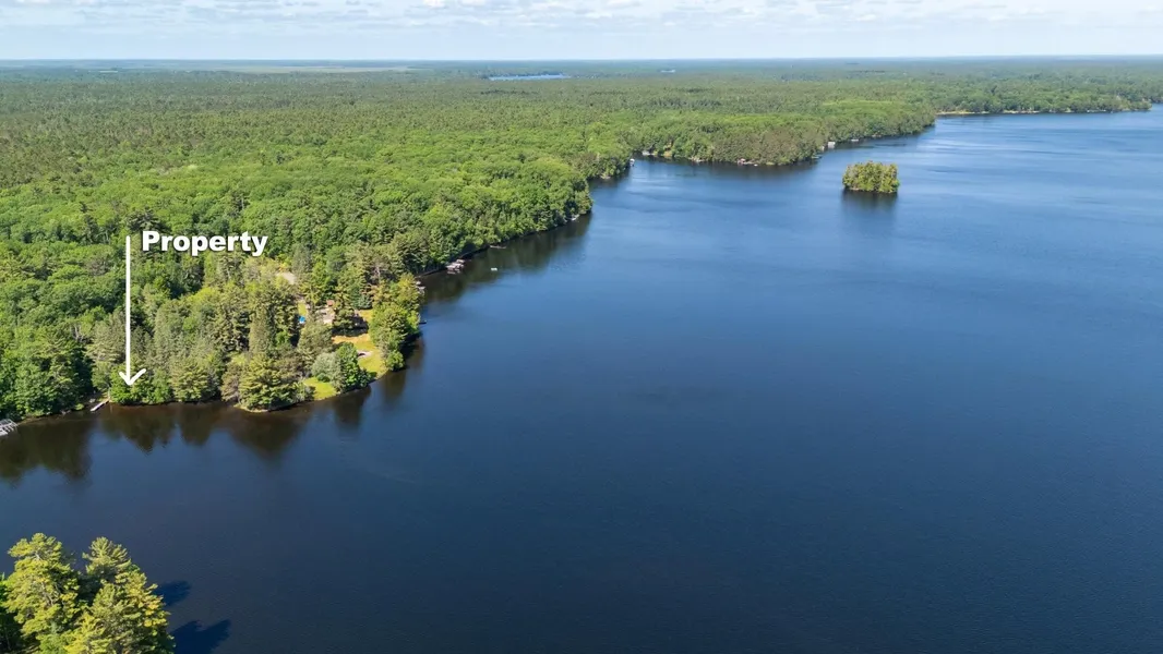 Beautiful private setting on Island Lake on the Manitowish Chain of 10 Lakes! 500+ feet of sand frontage (around a point) with 6+/- acres offers a beautiful building site to build your dream Up North Home! There are several building site areas which could work for a walk-out lower level and there is a gorgeous park like level setting down by the lake which is perfect for a great recreation/picnic/game area. One level living with 4 bedroom, 2 bath home. Living room with wood burning stone fireplace, kitchen, finished utility room, primary bedroom with primary bath, 3 other bedrooms and full bath. Home can be used while you build and then become a guest home! Home needs some updating. Attached 1 car garage and detached 2 car garage plus garden shed. Great location with easy access off of USH 51 and minutes from downtown Manitowish Waters and the paved bike trail system. Come Up North where you can recreate all year long! Off water lot available across the street see MLS 212868!