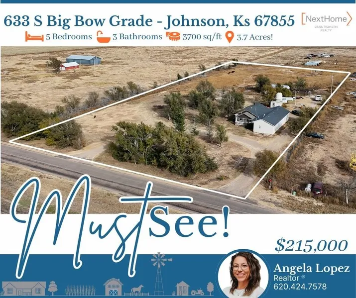 Imagine waking up in the peaceful Kansas countryside, coffee in hand, watching the sunrise stretch across your land while your animals start their day. Just 10 miles from Ulysses, this cozy 5-bedroom, 3-bath home offers 3,700 sq ft with an inviting open layout, an eat-in kitchen, a warm living room, and a formal dining room perfect for gatherings. The original 1950 home blends beautifully with a spacious 2016 addition. With nearly 4 acres there's plenty of room for horses, cattle, or 4-H animals plus a barn to keep them out of the elements. Enjoy quiet country living, and the convenience of being close to town. In the evenings, relax on the porch and watch those unforgettable Southwest Kansas sunsets settle over your acreage. This is cozy country living at its best. Call Angela Lopez @ 620.424.7578 for a showing.
