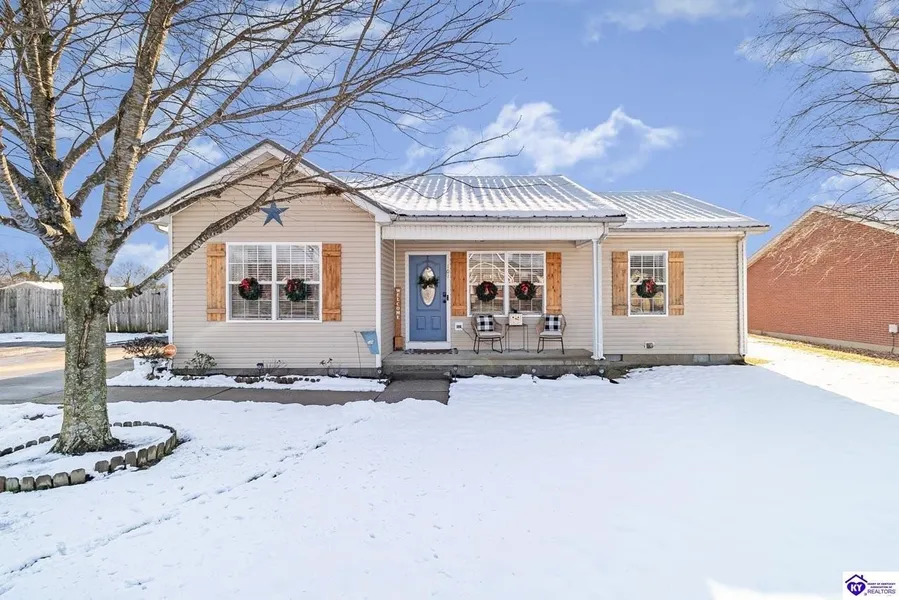 Welcome to this adorable 3 bed, 2 bath ranch home nestled in the desirable Cottage Grove neighborhood of Bardstown! Situated on a generous .32 acre corner lot, this charming residence offers both comfort and style with a welcoming covered front porch and a sprawling, privacy fenced backyard - perfect for outdoor enjoyment and entertaining. Inside, you'll appreciate the thoughtful updates and inviting spaces throughout. The living room features a striking shiplap tray ceiling and a fireplace that serves as the focal point - ideal for cozy evenings at home. Natural light fills the space, creating a warm and welcoming atmosphere. The eat-in kitchen is beautifully appointed with granite countertops, crisp white cabinetry, stainless steel appliances, and an attractive subway tile backsplash. Retreat to the primary bedroom suite, highlighted by a decorative tray ceiling and an accent shiplap wall. This peaceful haven also includes a convenient en suite bathroom and a spacious walk-in closet. Step outside to the covered backyard patio - a wonderful space to entertain or unwind. The adjacent firepit area offers the perfect setting for gathering with friends, roasting marshmallows, or simply enjoying a quiet evening under the sky. With newer mechanicals and a newer metal roof, you'll have peace of mind for years to come. Don't miss your chance to own this amazing home - schedule your showing today!