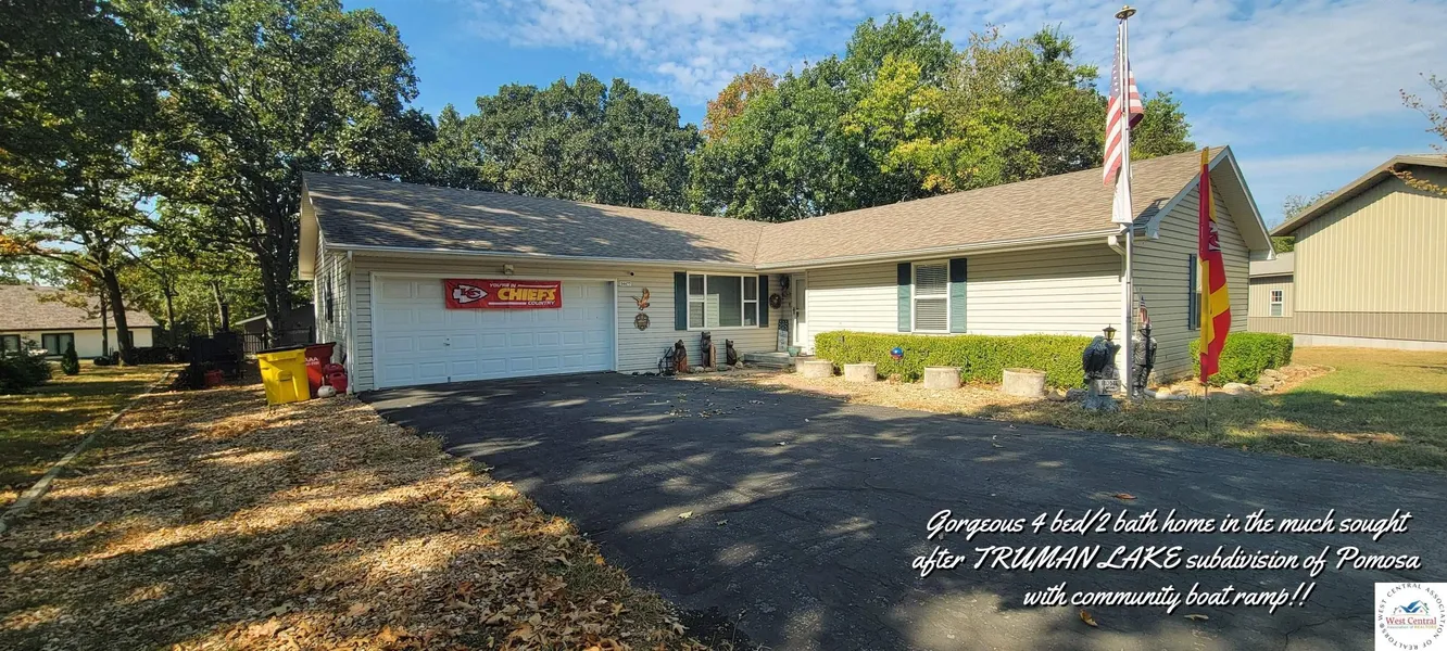Gorgeous 4 bdrm 2 bath rambling ranch with stunning views of TRUMAN LAKE in the much sought after lake subdivision of POM OSA with community boat ramp. Wonderful open floor plan with newer luxury vinyl & crown molding throughout. The massive living room is made for entertaining all your friends & family. You won't miss out on the fun, as the kitchen is open to the living room & dining room. Large breakfast bar & newer appliances in this lovely kitchen. Just off the kitchen is a wonderful enclosed porch, a great spot for morning coffee with lake views to die for. The dining area will easily hold a large table & hutch. Enjoy the lake views from this expansive master suite that will easily accommodate large furniture & a sitting area. Large walk-in closet & the very spacious master bath has walk-in shower & jetted tub for soaking after a long day on the lake. Second bedroom/office just off entry. The back side of the home has 2 other nice size bedrooms, one with a walk-in closet & full bath between. The large laundry room has room for more storage or pantry area. A deep 2 car attached garage & paved driveway. A huge fenced backyard with patio & stunning views of Truman Lake. This wonderful subdivision is all paved just off scenic Hwy 83. These beautiful one level homes are hard to find! This fantastic lake home is ready for some new memories. Don't wait till its to late! Buy that lake home, you won't regret it!!