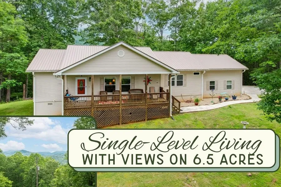 Mountain refuge on 6.59 acres with VIEWS!Step inside to a spacious, single-level floor plan offering a split-bedroom design and open concept in the center featuring your kitchen/dining space & living room. The well-appointed kitchen has everything you need from the stainless-look appliances & 5-burner gas range to the cabinets galore. Living room offers a cozy stone-stacked gas fireplace (logs replaced in 2024). Primary suite boasts a large walk-in closet & en-suite bath w/both a step-in shower & jetted tub. Across the way, you'll find the 2 guest bedrooms, full bath & laundry room across the hall. High-quality construction features such as high interior ceilings, H/W floors & metal roof. Electric furnace with propane backup for those chilly nights & A/C recently replaced with a Bosch system. Great entertaining spaces on the rear screened deck, or sit & watch the clouds over the mountain...