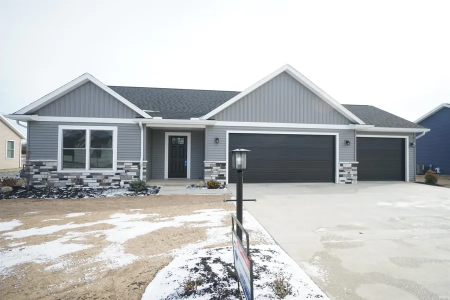 Brand new and ready to move into, 3 bedroom, 2 bathroom, 1,530 sq. ft. home with an attached 3 car garage, on a professionally landscaped, seeded, and irrigated lot with city sewer, city water, and fiber internet. This open floorplan house has a split bedroom design with generously sized bedrooms and a conveniently placed full bathroom for guests and bedroom #2 & #3. The primary bedroom suite features a double vanity, walk in shower and walk in closet. The large living room is connected to the fully appointed kitchen with custom stained hickory cabinets, stainless appliances, kitchen island breakfast bar, a large walk in pantry with custom wood shelving, and the dining room with slider door access to the patio overlooking the backyard. Quality construction: 2 x 6 exterior walls with R-20 insulation, attic insulation of R-40, insulated windows with lifetime warranty, LVP wood plank flooring, main level laundry with utility sink, etc. Outside you will find a maintenance free exterior with vinyl siding and front stone accents. The Eastfield subdivision offers the benefits of city utilities with an "In the country" setting.