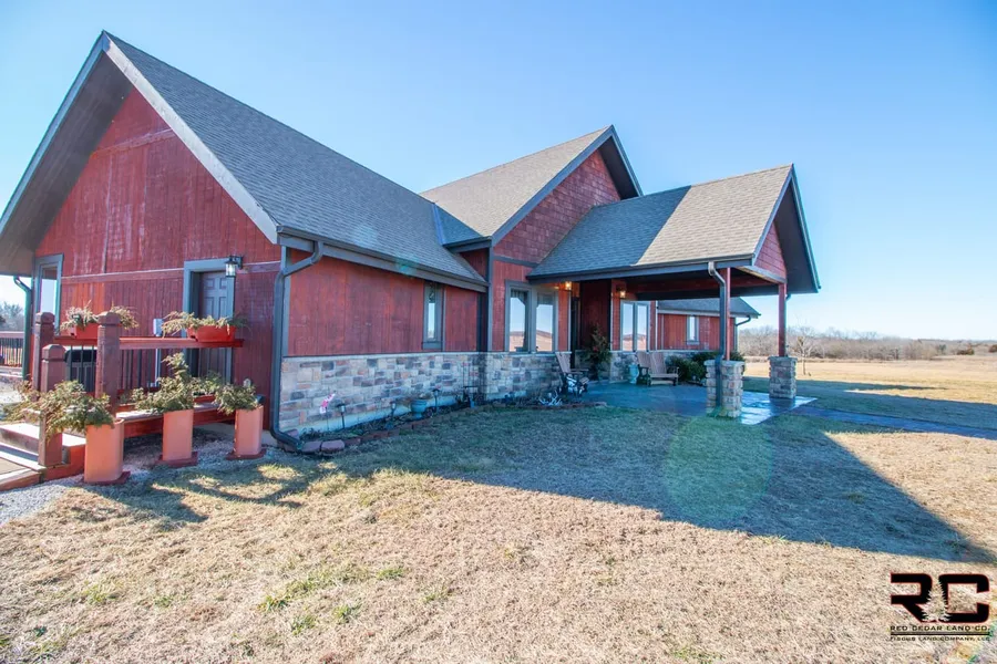 Property Description: Located just outside of Kincaid Kansas off of HWY 31 this beautiful ranch style home offers 3 bedroom, 2 bath, 3 car detached garage, tall vaulted ceilings, granite countertops, tile, wood floors, a long secluded driveway, big deck and patio, privacy fence, private entry gate, and a 3+/- acre fishing pond! Nestled on 40+/- acres you can enjoy looking at all the wildlife right out your back windows. The back deck / patio area is perfect for grilling, entertaining friends, or utilizing the hottub. As soon as you enter the driveway you can tell no expense was spared when building this home.