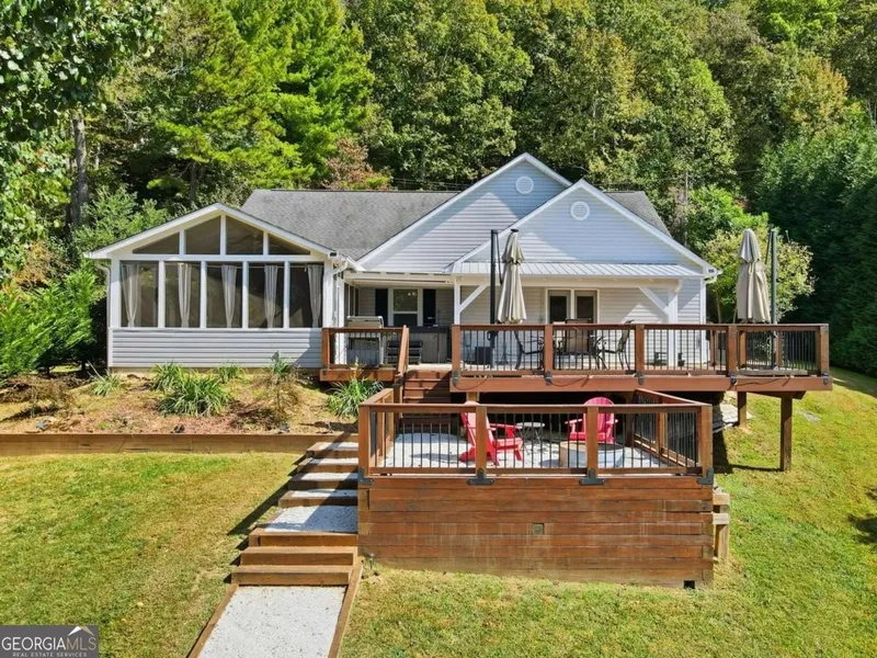 Lakefront move in ready Retreat on Private Talona Lake - Peaceful Mountain Living at Its Best! Escape to your own slice of North Georgia paradise at 201 Talona Lake Terrace, a beautifully maintained 3BR/2BA lakefront home offering no HOA, Public water, no restrictions, all paved roads access, tranquility, comfort, and year-round water views. Perfectly situated on a private 1 acre lot with lush green grass, and expansive, very nice laying yard overlooking the Lake, this one-level home combines rustic mountain charm with modern updates. Inside, you'll find vaulted ceilings, hardwood floors, and an open-concept layout centered around a cozy fireplace with a newly added wood accent wall. The updated kitchen showcases wood cabinetry, oversized island with leathered granite countertops, tile backsplash, and stainless steel appliances. The primary suite offers peaceful lake views, hardwood floors, a custom closet, custom built in, and an ensuite bath with step shower with floor to ceiling tile, granite countertops, and double vanity. Unique, oversize laundry room with tile flooring, utility sink, and cabinetry storage. Enjoy the outdoors from the oversized screened-in porch with seating area, custom wood accent wall, garden closet, hot tub with hard top, easy open cover, and gas hook-up for grilling. Expansive decking and custom built fire pit. Additional features include a whole-home 24KW Generac generator, new interior paint, roll away door screens, oversized 2-car garage with built in storage shelving, large unfinished upper level, and a private lakeside, Pergola Deck, fire pit area, step in entrance to the lake - perfect for fishing, relaxing, or kayaking. Conveniently located less than 5 minutes to town, this property offers the ultimate blend of privacy, comfort, and serene lakefront living on beautiful Talona Lake.
