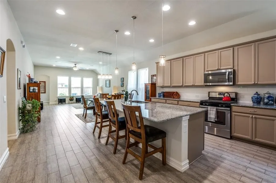 The Perfect Christmas Gift is 5312 Leyton Drive in McKinney TX! Beautifully designed single-story home with a private pool in the desirable Auburn Hills community. This property combines modern style with everyday comfort, offering open living spaces filled with natural light, wood-look porcelain tile floors, and a versatile layout featuring three bedrooms plus a flexible room ideal for a home office, gym, or playroom. The open kitchen is perfect for entertaining, showcasing granite countertops, stainless steel appliances, a gas cooktop, and a spacious island that invites gathering. The primary suite is a true retreat with a bay window, dual vanities, towel warmer, two walk-in closets, and a luxurious walk-in shower with both rain and handheld showerheads. Step into your backyard oasis complete with a sparkling pool, covered patio, and plenty of space for relaxing, grilling, or hosting family and friends. Located in award-winning Prosper ISD and just minutes from H-E-B, Costco, hospitals, and the outer loop, this home offers easy access to both Frisco’s shopping and entertainment and downtown McKinney’s charm. This is North Texas living at its best—stylish, convenient, and ready for your next chapter.