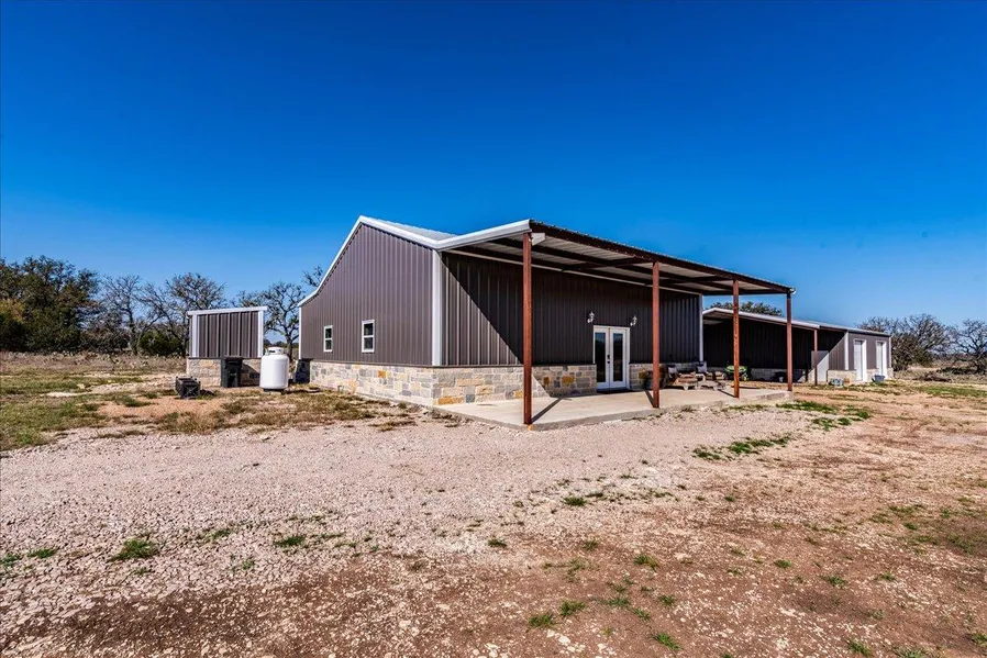 Welcome to your private piece of Texas paradise in the gated community of the Ranches at Blackbuck Ridge! Situated on 10.75 acres, this beautiful property features a charming barndominium with 2 spacious bedrooms, 1 full bath, and an open-concept living area with soaring ceilings. The interior boasts durable and stylish vinyl wood-like flooring, perfect for low-maintenance country living. Just steps away, youll find a massive 40 x 40 workshop ideal for hobbies, storage, or projects, complete with washer and dryer hookups. Whether you're looking for a weekend retreat, a full-time residence, or a place to expand your outdoor lifestyle, this property has it all. Enjoy the serenity, wildlife, and wide open skies, plus the benefits of being located in the gated Ranches at Blackbuck Ridge community within Burnet CISD. Come experience peaceful Hill Country living at its finest!