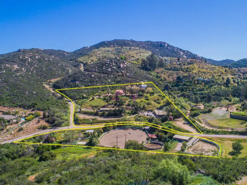 Possible attached granny flat has loft, bedroom and bath and is plumbed/prepped for kitchenette. Land on both sides of the road is included in this offering. See aerials with approx. outline of land. The arena and some land area is separated from the house and barn areas by Twin Oaks Valley Rd. Gorgeous views. Priced to Sell!