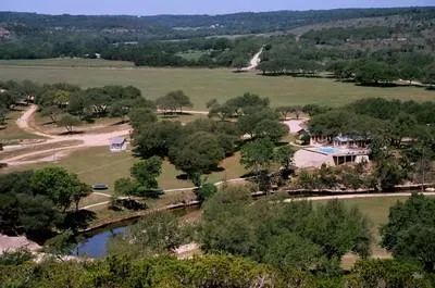 The main lodge is about 3,500 square feet, with 5 bedrooms, 5 bathrooms, two living areas, country kitchen, two fireplaces built around a central stone patio which opens to a fabulous swimming pool. The look and feel is rustic Hill Country, and the location perched above a cliff overlooking Onion Creek, park-like bottomland and rugged hills rising in the background is simply stunning.