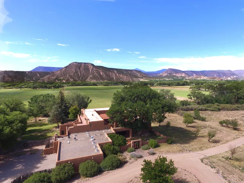 Rancho de Abiquiu is a once-in-a-lifetime opportunity to own a legacy estate in the heart of northern New Mexico. Situated along 4,250 feet of the Chama River, this 138 acre estate blends historic charm and agricultural bounty. The beautifully restored 13,000 square-foot Spanish colonial hacienda is surrounded by towering cottonwoods and overlooks lush, productive hay fields. The 315 acre-feet of senior (pre-1907) water rights provide abundant and dependable irrigation and are a valuable commodity in arid New Mexico. The resident elk herd can be viewed from the portal in the mornings and evenings. Rancho de Abiquiu offers luxury and pastoral living, with proximity to Santa Fe and Taos.