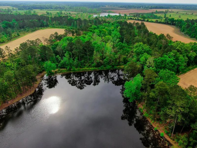 Water Features: +/- 5-acre pond for fishing and duck hunting. Another small pond on the SE of the property is a good wood duck hole and water source for wildlife. Wet weather creek with big hardwoods bisects the tract.