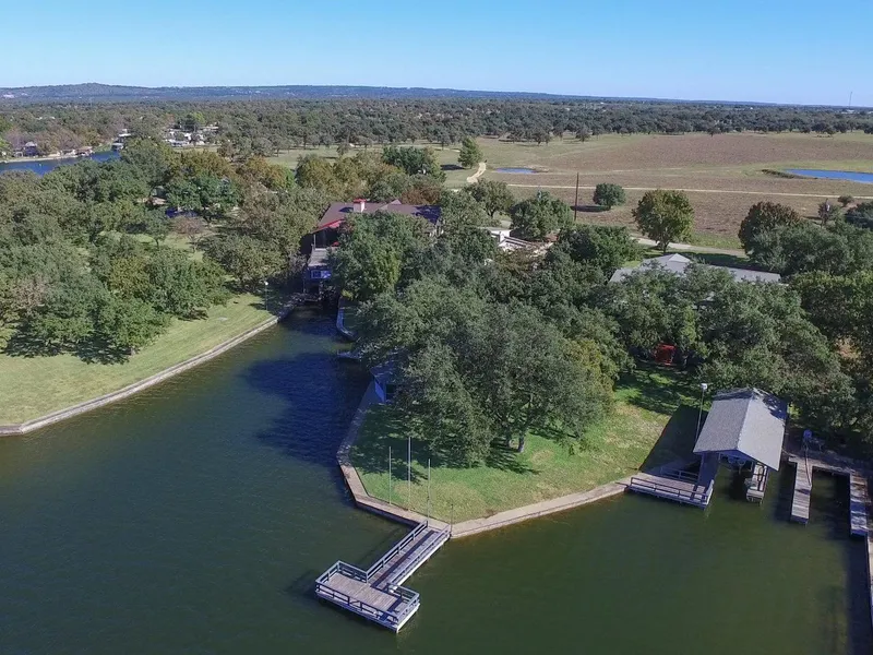 Rare lakefront property in Granite Shoals not available since 1983! This half-acre is nestled between private ranchland and Lake LBJ. Enjoy 300 feet of waterfront, shade from gorgeous oak trees and unobstructed open water and Hill Country views. Southwest exposure offers great sunsets. Relax on more than 2,300 square feet of decking, party lakeside in outdoor enclosed kitchen, and fish and swim off the huge T-head pier. Two-story home has five bedrooms, three full baths, two half baths, large utility/laundry room, indoor shop/craft room, three dining areas, oversized three-car garage and tons of closets! Floor to ceiling windows provide views from every room facing the lake! Large kitchen has island with prep sink, new Sub-Zero refrigerator, and lots of counter and storage space. Master bedroom suite and one additional bedroom are down. Home features vaulted ceiling in living room, fireplace, water softener, security system and sprinkler system fed from the lake. More lakeside amenities include two boat docks with lifts, boat house, fish cleaning station and even more dock space. Dont let this one-of-a-kind property slip away!