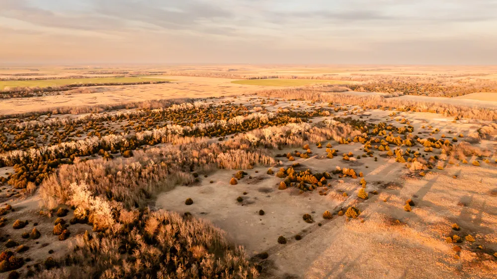 Thick dense cover situated in open country, from front to back this farm has large cottonwood, elm, and hedge tree windbreaks scattered across it. There are a few young walnuts that also show up in the windbreaks. Between the windbreaks are growing cedars mixed in with native prairie grasses, presenting an ideal location for future f...