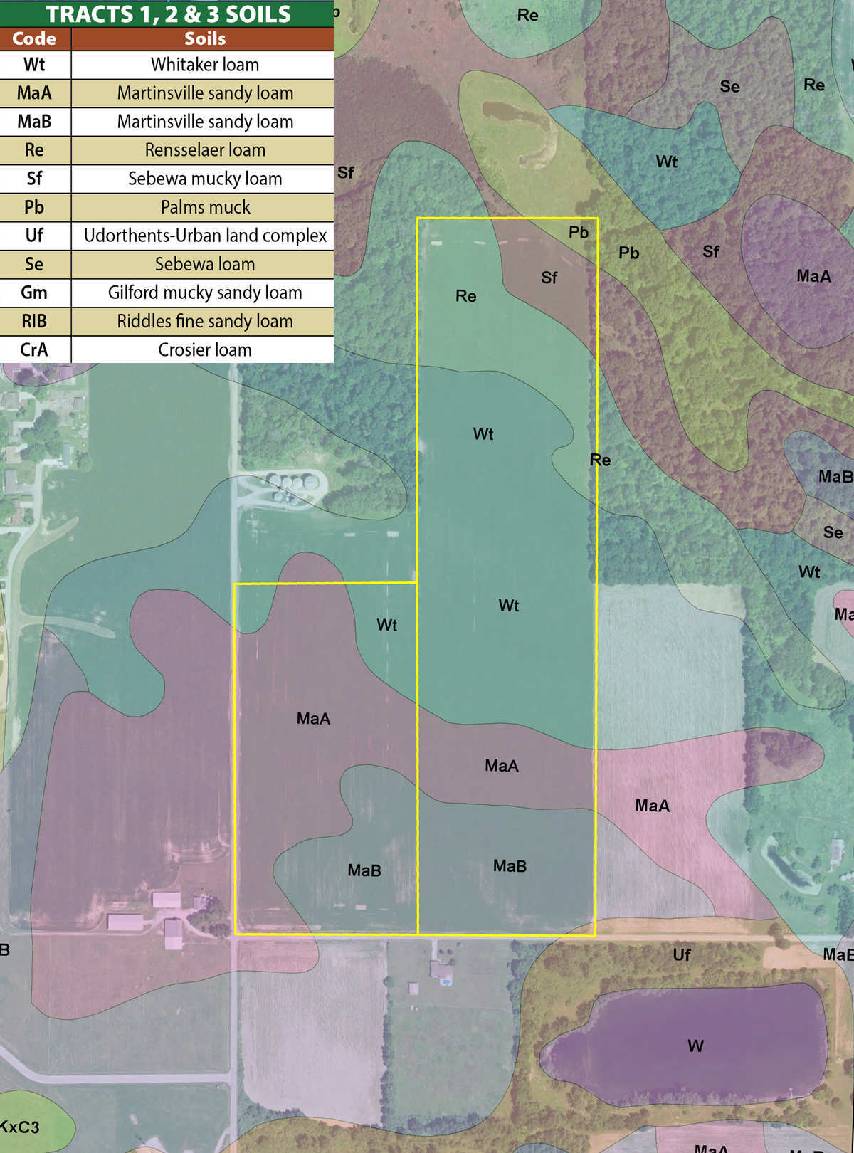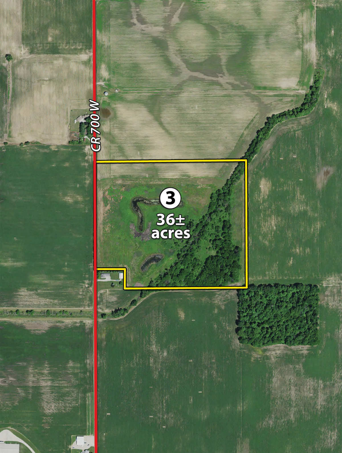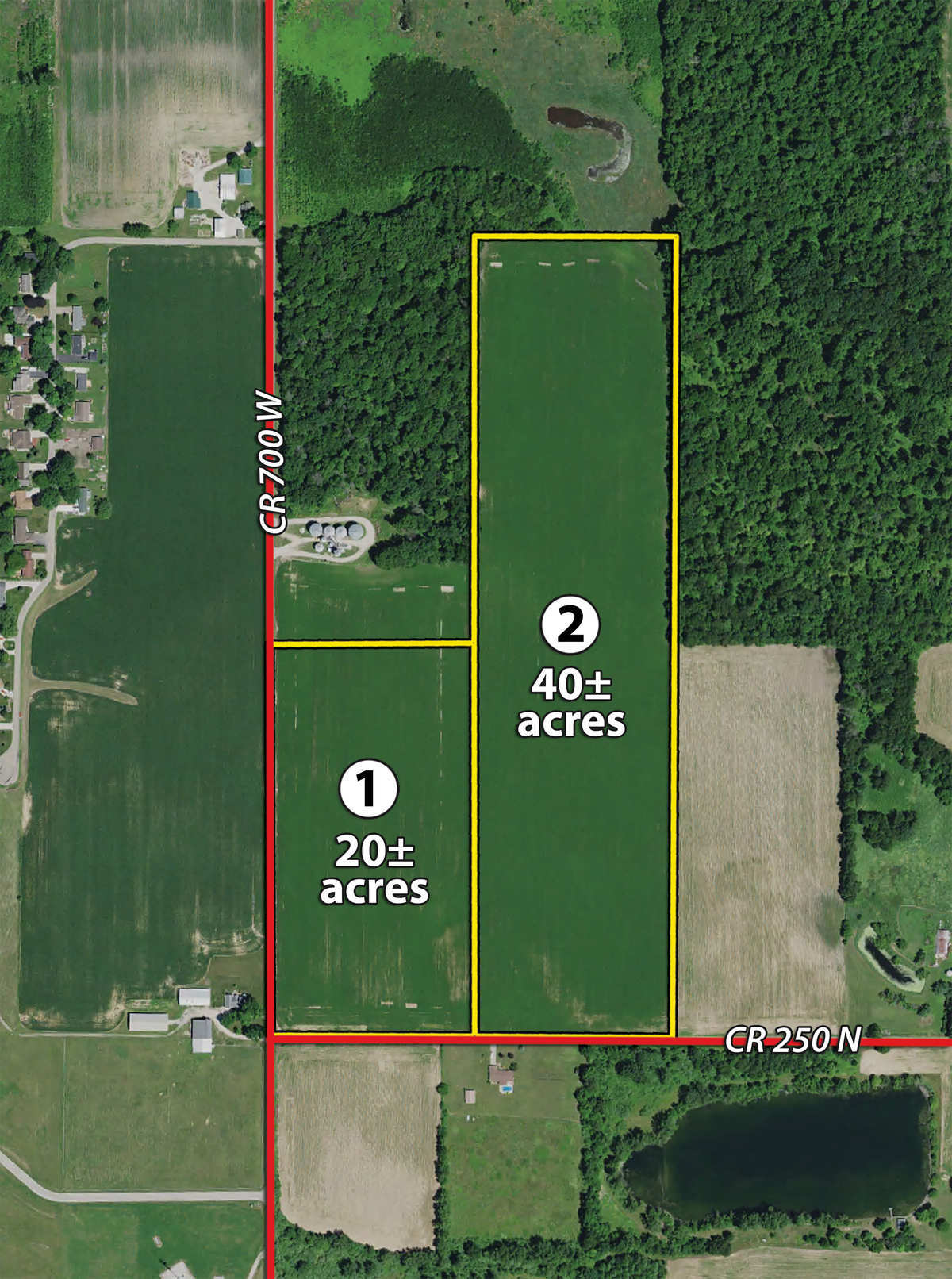Tract 1: 20 ac Nearly all, tillable productive acreage, and potential building site. On CR 700 W and 250 N Just north of US 30.