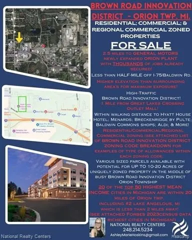 Located within Brown Road Innovation District RIGHT NEXT DOOR to Menards, Breckenridge by Pulte Homes, the new HYATT HOUSE Hotel, & more! Direct access to I-75, minutes from Great Lakes Crossing & The newly expanded GENERAL MOTORS ORION PLANT (set to be one of the largest in the COUNTRY!)! Surrounded by highly developed Brown Road & Baldwin Road in Orion Township, this location could have constant visibility & high traffic volume—prime for business or residential success!