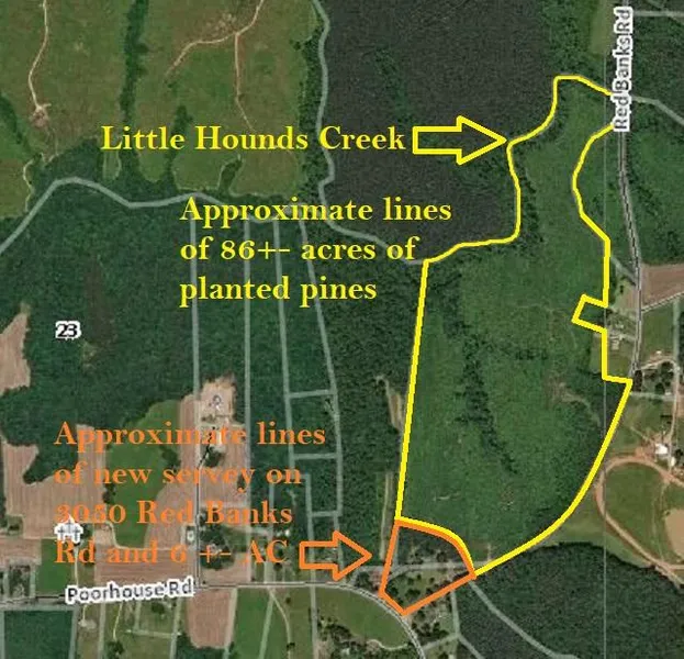 Gorgeous tract of planted pines estimated at 7-8 years old, surrounded by mature timber and pastures. This 86+- acres was recently surveyed off of 3050 Red Banks Road, Victoria, VA. The house is listed for sale separately and includes 6+- acres of land. Fresh survey markers separate the 86+- acres from the house. Lots of road frontage on Red Banks Road. Little Hounds Creek defines the northern property line and it follows the creek as it moves southwest back toward the house. Great area for recreation especially hunting! This is an excellent timber investment but could also be subdivided and developed. Beautiful views of Little Hounds Creek and the gently rolling hills of southside Virginia!
