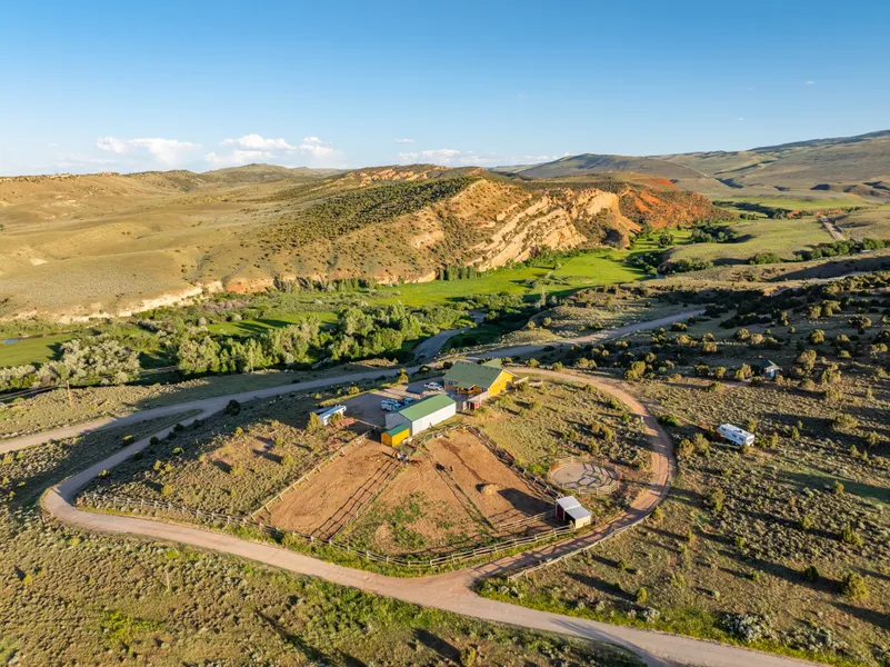 Nestled 10 miles south of Lander, WY, this stunning equestrian property offers an unparalleled lifestyle of tranquility and natural beauty. Overlooking the Little Popo Agie River in the breathtaking Red Canyon area, the Property boasts 360-degree views of the striking red bluffs, providing a picturesque backdrop to everyday life.