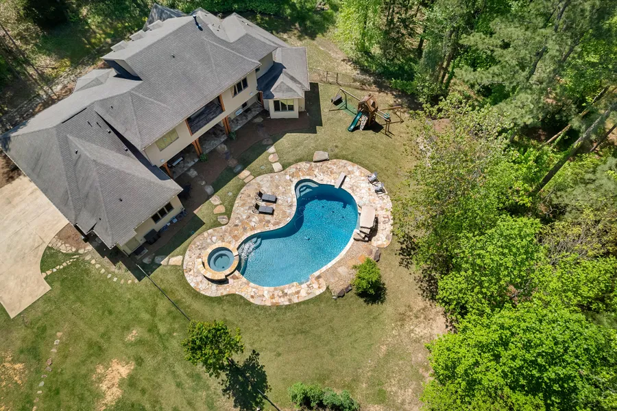 This remarkable 7+ acre estate features a meticulously designed custom home by Michael Allen Homes. With 3 main-level bedrooms and 2 more plus a spacious bonus room upstairs, offering functional ample space. The gourmet kitchen boasts two large center islands, beautiful countertops, chef-grade appliances, and a walk-in pantry. The kitchen flows into the great room, featuring a gas fireplace flanked by built-ins. A tiled bar area with a pass-through serving window opens to the pool/patio area. The master suite includes a sitting area, dual walk-in closets, and a luxurious bathroom connecting to the laundry room. Two additional main-level bedrooms offer versatility or a home office, and upstairs, two more bedrooms with en suite bathrooms large closets, a bonus room, second laundry room provide convenience. Outside, the covered patio features integrated wiring, speakers, & a custom outdoor kitchen. The impressive pool and hot tub with a rock water feature complete this resort-like estate.