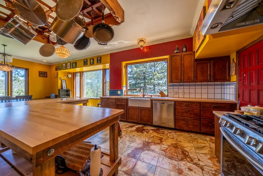MOTIVATED SELLER for potential 11 acre home/land estate. Extraordinary custom design home on 5+/- acres with adjacent 6.09 acre parcel also for sale in the heart of Julian **. Designed, built and once occupied by world renowned artist, Constantine Cherkas, this home holds a wealth of history and fine craftsmanship with unique features and architectural design throughout such as raised ceilings, marble and wood flooring, large built-in bookshelves and six handsome fireplaces. With 4428 esf., 3 plus 1 optional bedroom, 3 1/2 baths and three stories, this home is the largest in the Julian Historic District and offers beautiful views of the town and surrounding areas. Additional features include the many recent upgrades such as a chefs gourmet kitchen, dual pane windows, newer roof and an expansive Redwood deck, which is ideal for entertaining and taking in the natural beauty. Major added bonus - never a power bill! Owner owned grid tied solar electric system with battery back up installed two years ago, a must have in Julian. With a partially fenced yard and multiple small animal outbuildings this home is turnkey ready for you and your family.